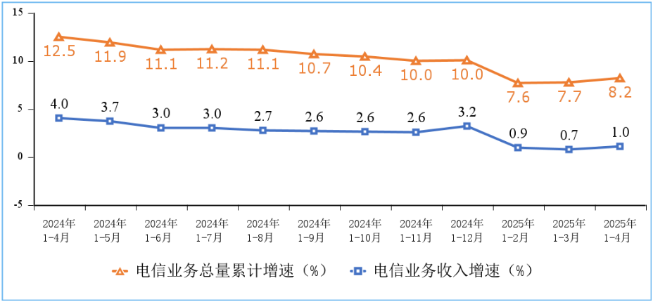 前4个月,电信业务收入累计完成5985亿元,同比增长1%。按照上年不变价计算的电信业务总量同比增长8.2%,增速较一季度回升0.5个百分点。