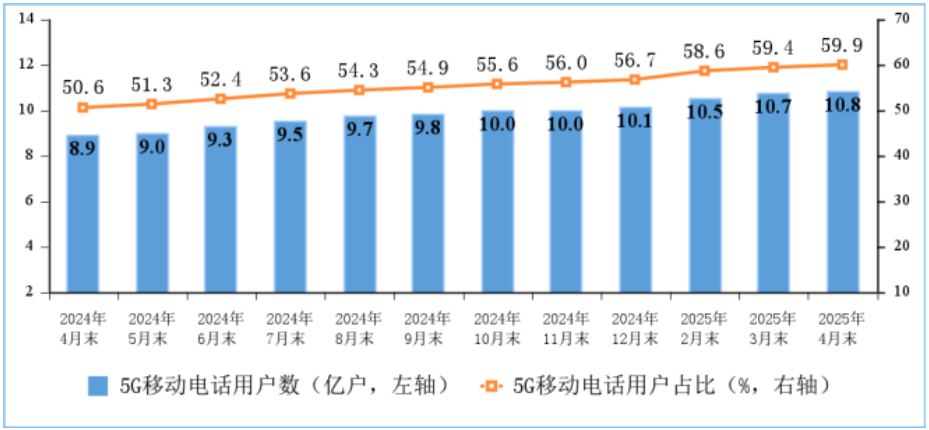 移动电话用户规模稳中有增,5G用户占比近六成。截至4月末,三家基础电信企业及中国广电的移动电话用户总数达18.03亿户,比上年末净增1344万户。其中,5G移动电话用户达10.81亿户,比上年末净增6687万户,占移动电话用户的59.9%。